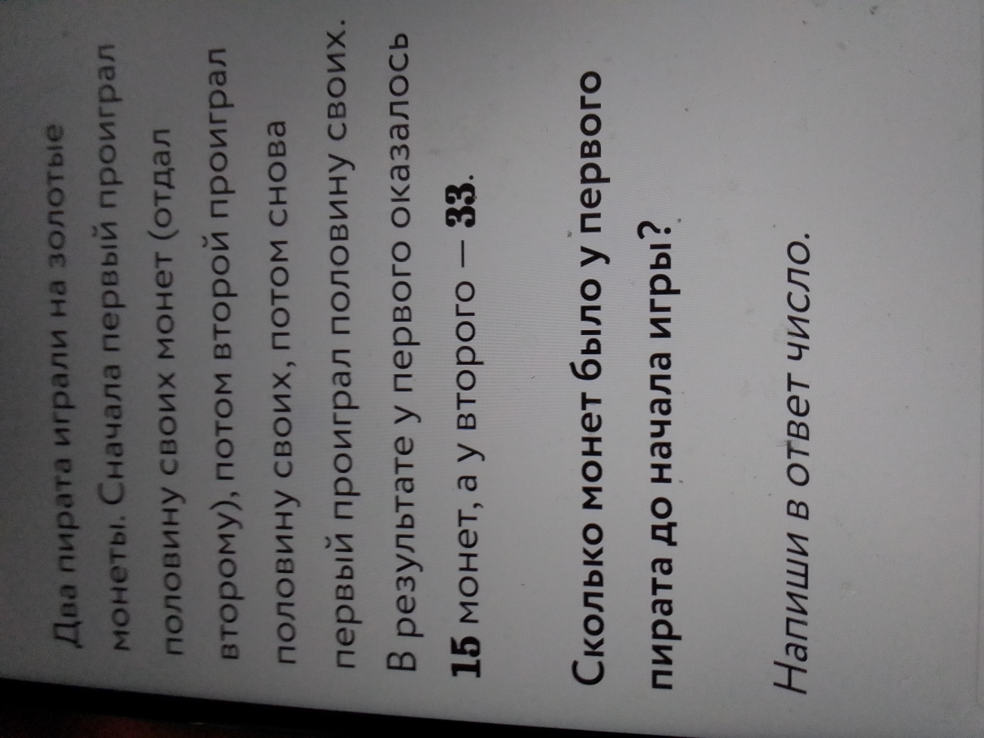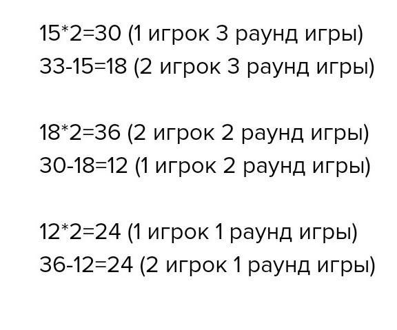 отсчет с конца первый проиграл второму половину своих монет,а у него осталост 15 значит перед последней игрой у него было 30 монет,а у второго 48-30=18 монет. но эти монеты у него осталист после того,как он проиграл первому половину своих, значит перед второй игрой у второго было 18*2=36 монет,а у первого 48-36=12 монет. а это ровно половина того,что он проиграл второму после первой игры,значит до начала игры у первого было 12*2=24 монеты.а у второго 48-24=24.