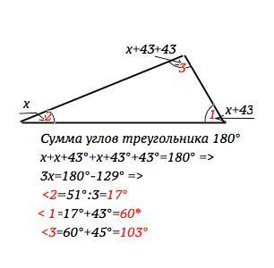 Тогда первый угол равен х+43°; он меньше третьего на 43°, поэтому