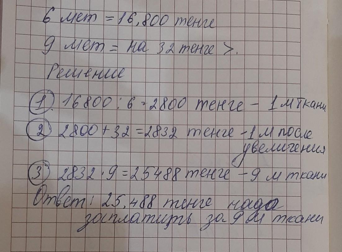 за 6 метров ткани заплатили 16800,сколько надо заплатить за 9 метров ткани ,если цена увеличится на 32 тенге?