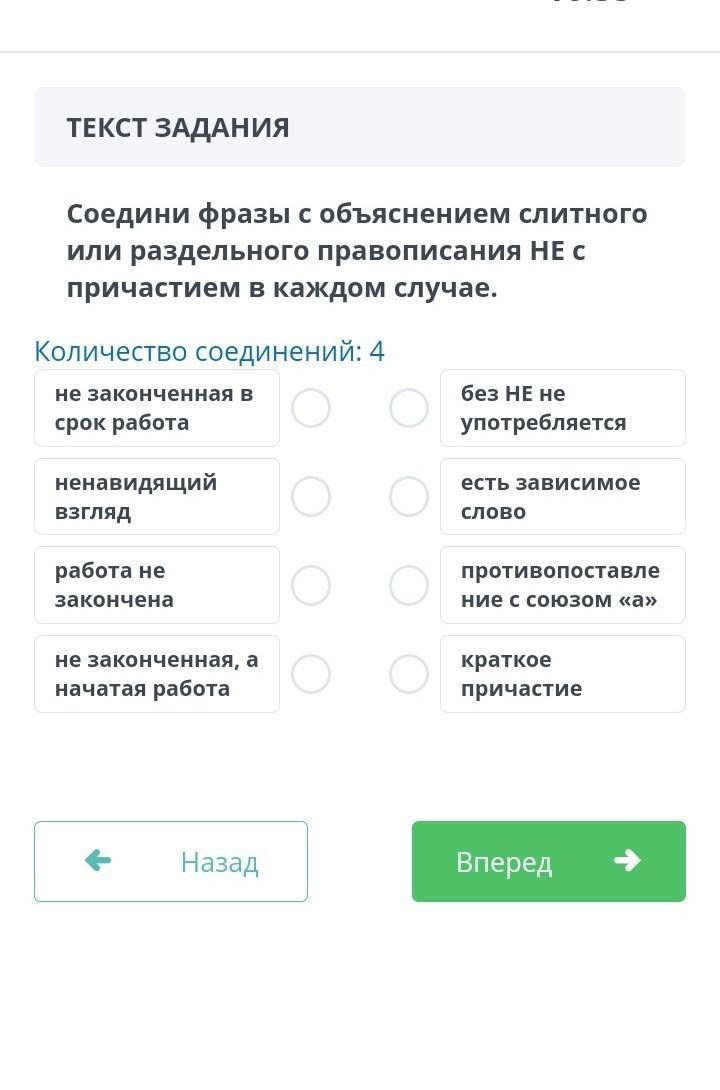 Соедини фразы с объяснением слитного или раздельного правописания НE с причастием в каждом случае. Количество соединений: не законченная в срок без НЕ употребляется ненавидящий взгляд зависимое слово работа закончена противопоставле союзом «а» не законченная, а начатая работа краткое причастие
