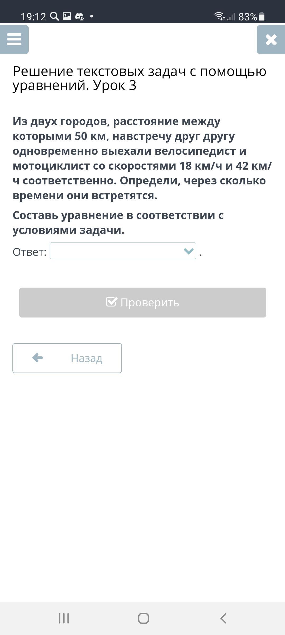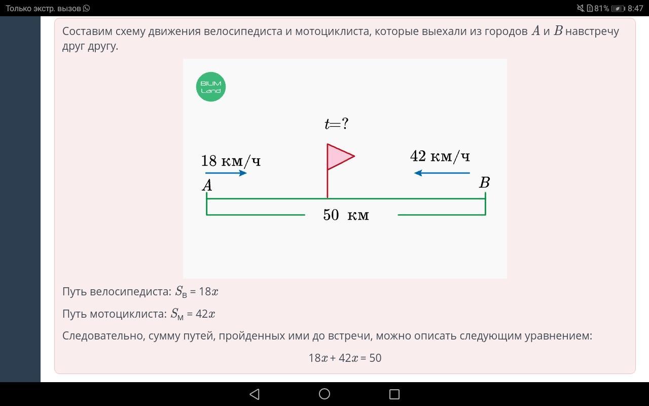 Из двух городов, расстояние между которыми 50 км, навстречу друг другу одновременно выехали велосипедист и мотоциклист со скоростями 18 км/ч и 42 км/ч соответственно. Определи, через сколько времени они встретятся.