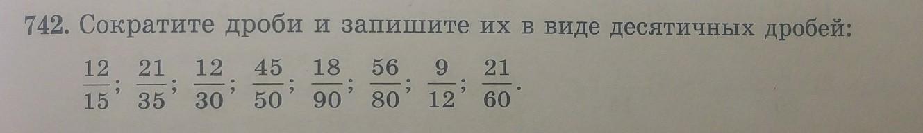 742. Сократите дроби и запишите их в виде десятичных дробей. Пожалуйста надо СРОЧНО! Сделайте проверенный способ и на фото решение покажите пожалуйста.