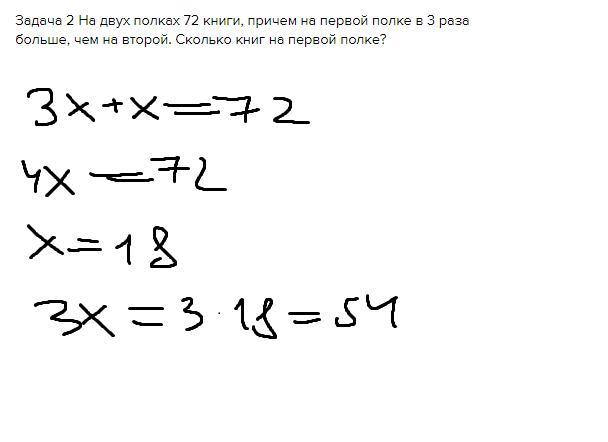 Задача 2 На двух полках 72 книги, причем на первой полке в 3 раза больше, чем на второй. Сколько книг на первой полке?