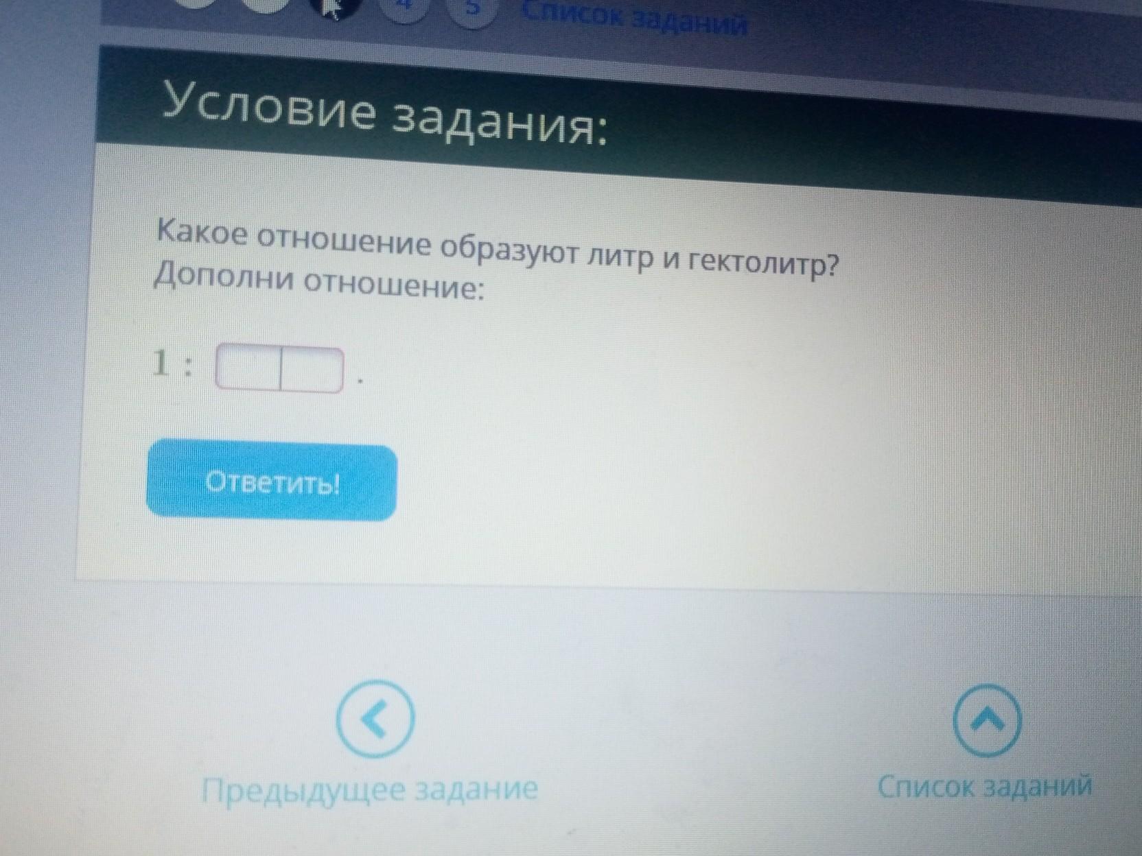 Приставка гекто- означает что единицу СИ умножают на 10² то есть гектолитр=литр*10² литр/гектолитр=1/10²=0,01