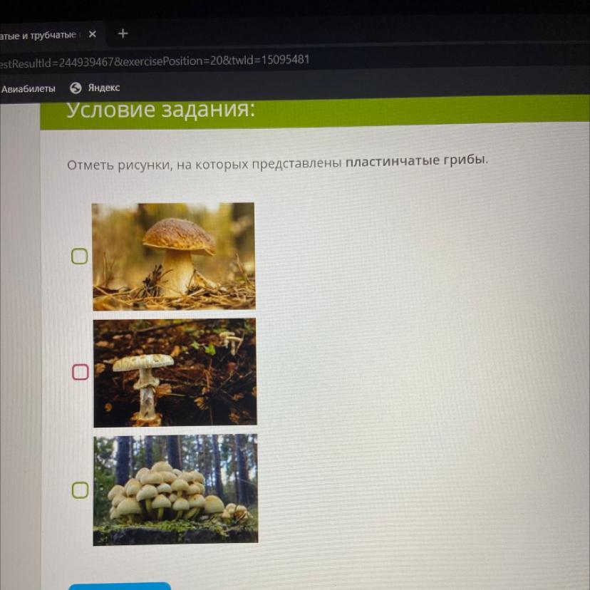 Отметь рисунки, на которых представлены пластинчатые грибы.