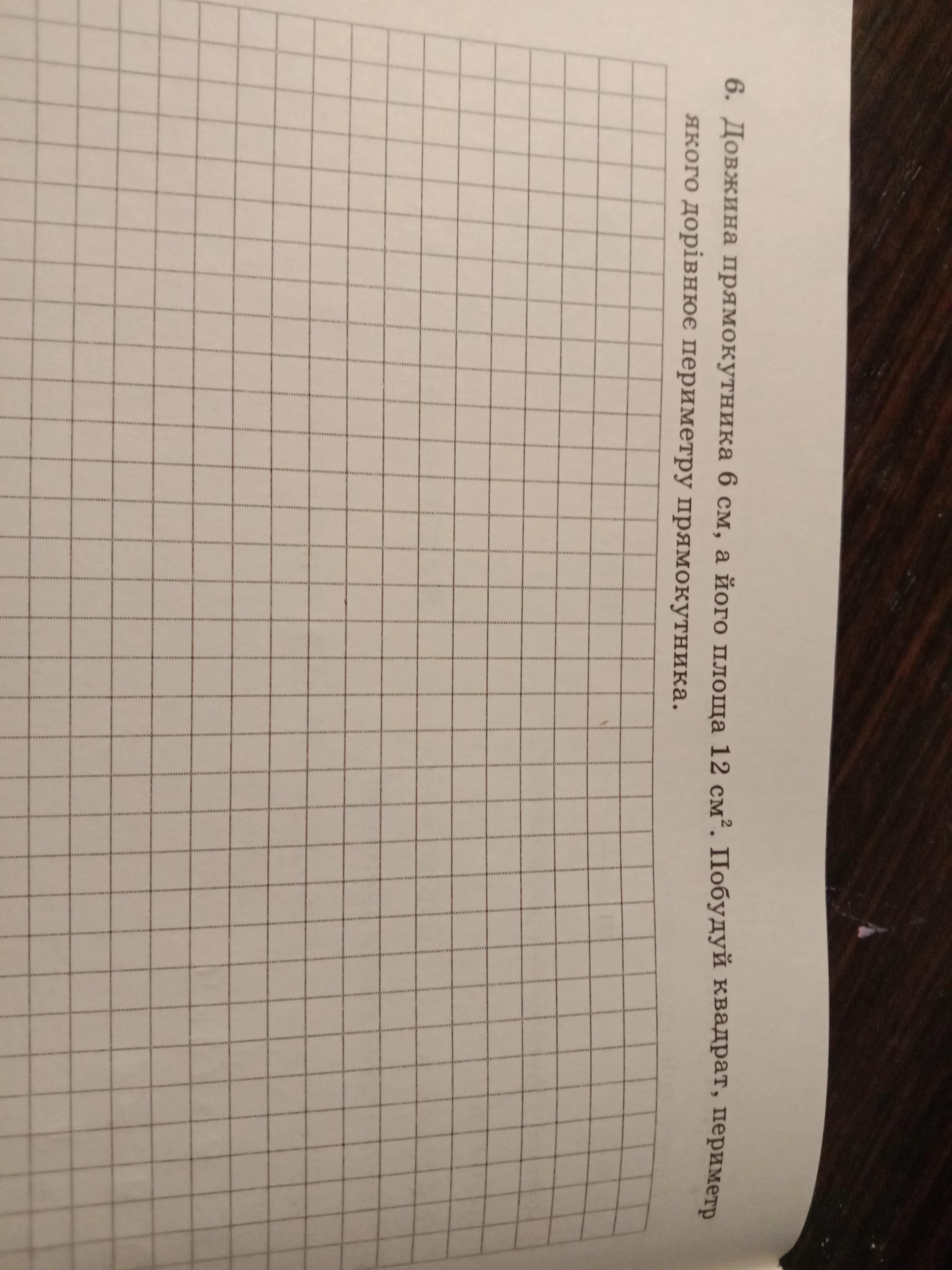 Довжина прямокутника 6 см, а його площа 12 см2.Побудуй квадрат, периметр якого дорівнює периметру прямокутника.