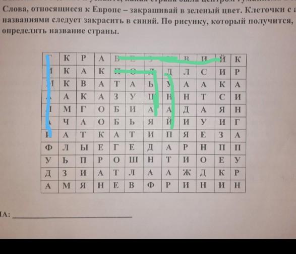 Выполните задания и узнайте какая страна была центром гуманизма в 16 веке.Слова относящиеся к Европе-закрашивайте зелёным.Клеточки с Азиатскими названиями следует закрасить в синий .По рисунку который получится нужно определить название страны.