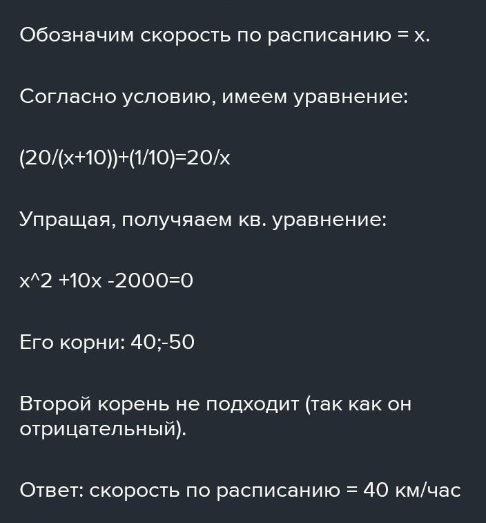 Поезд был задержан в пути на 6 мин. Это опоздание было ликвидировано на промежутке в 15 км за счёт увеличения скорости на 40 км/ч. Найдите скорость поезда по расписанию, а также скорость, с которой поезд двигался на перегоне.