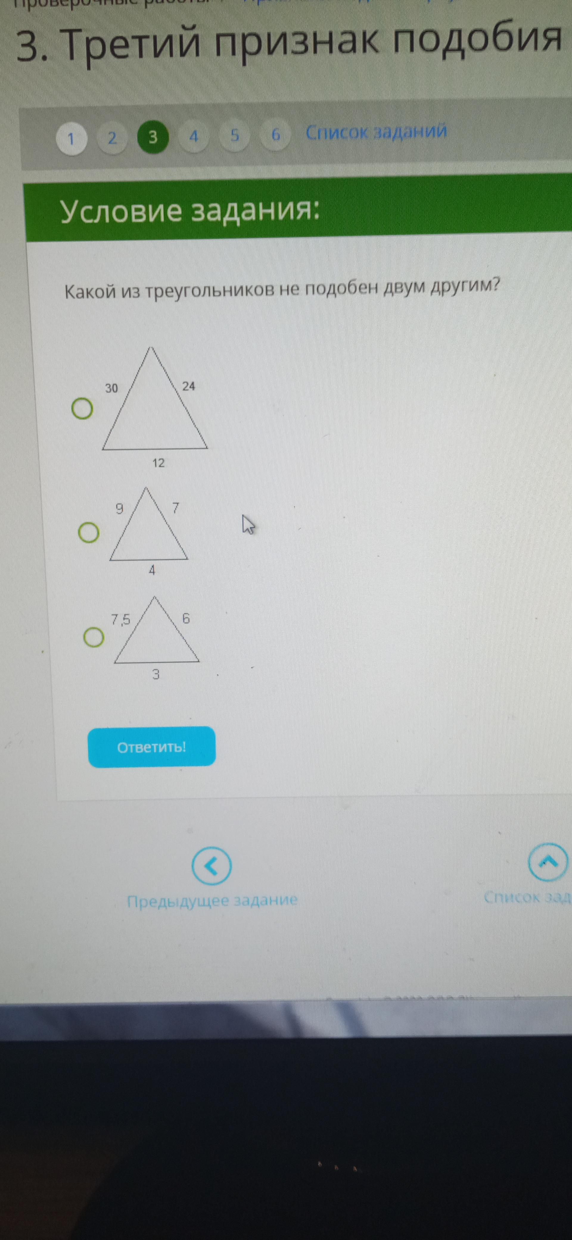 Третий признак подобия треугольников. Если три стороны одного треугольника пропорциональны трем сторонам другого треугольника, то такие треугольники подобны.
