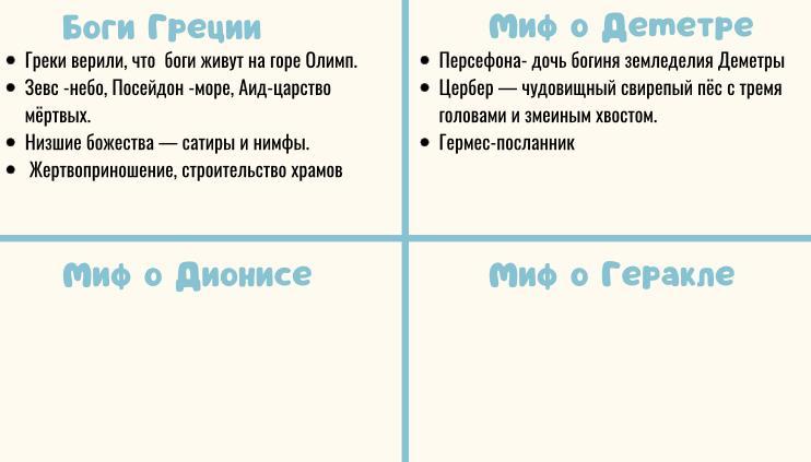 Доделать квадрат знаний, начатый в школе Квадрат знаний предполагает разделение листа на четыре равные части и работу с учебником 1 квадрат- Боги Греции 2 квадрат-Миф о Деметра 3 квадрат-Миф о Деонисе 4 квадрат-Миф о Геракла У ребят должны получится краткие тезисы по теме. Прикладываю пример того, как это должно выглядеть.