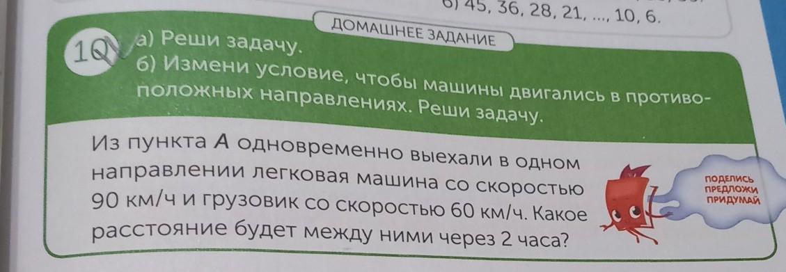10 ДОМАШНЕЕ ЗАДАНИЕ а) Реши задачу. 6) Измени условие, чтобы машины двигались в противо- положных направлениях. Реши задачу. ПОДЕ ПРЕД ПРИ Из пункта А одновременно выехали в одном направлении легковая машина со скоростью 90 км/чи грузовик со скоростью 60 км/ч. Какое расстояние будет между ними через 2 часа?