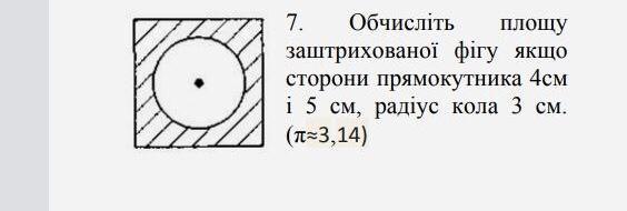 За умови, що радіус кола дорівнює 3 см , його діаметр дорівнює 6 см, а це перевищює довжину прямокутника ( 5 см ) та його ширину ( 4 см ). Це не відповідає малюнку. Скоріш за все діаметр кола дорівнює 3 см. У цьму випадку маємо: