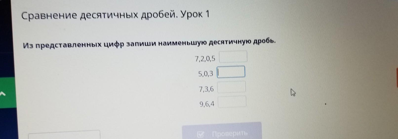 Из представленных цифр запиши наименьшую десятичную дробь. 7,2,0,5 5.0.3 73,6 9, 6,4 помогите