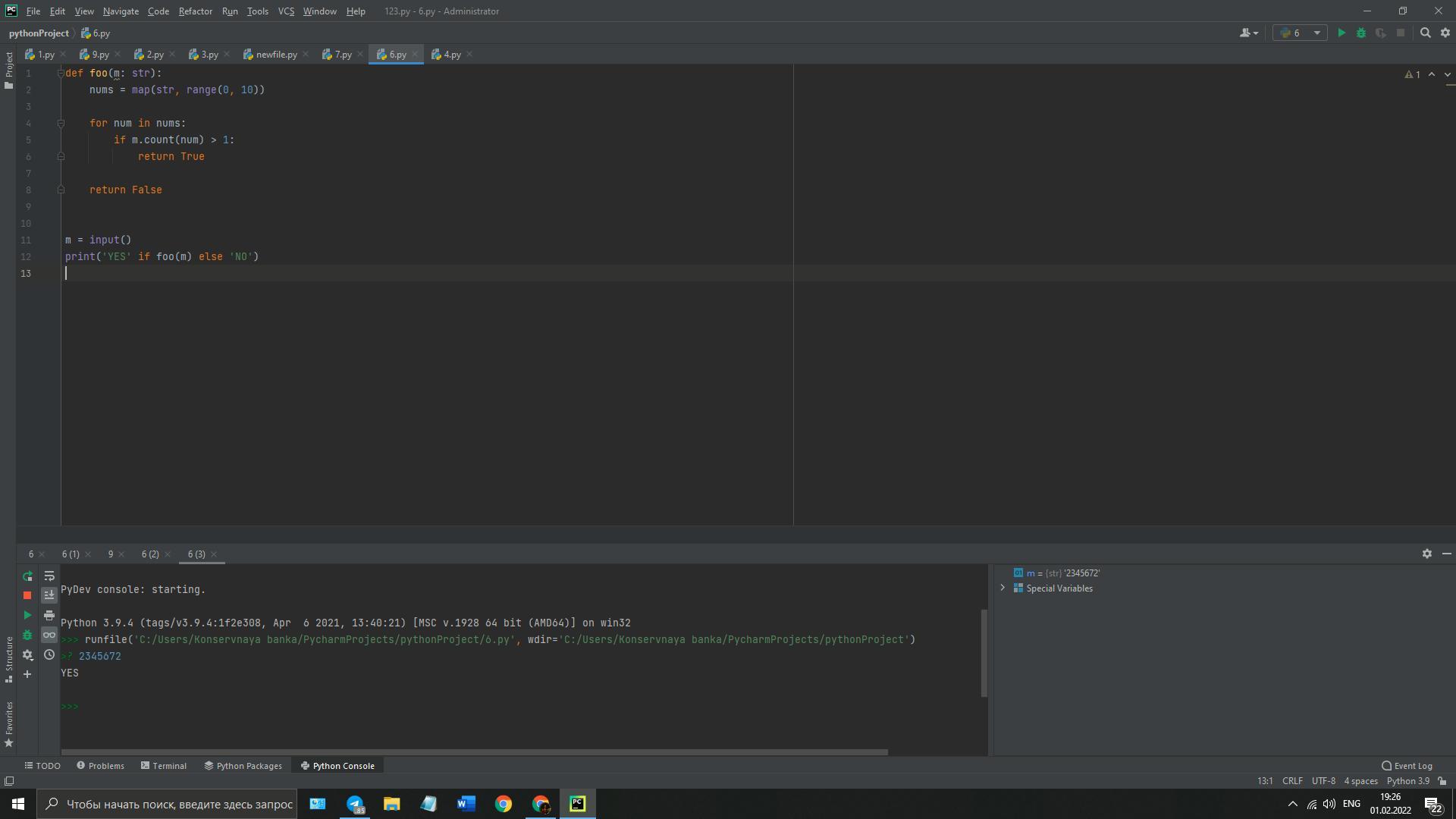 Определить ,есть ли в шестизначном числе , которое вводится с клавиатуры , повторяющиеся цифры. Вывести ДА или НЕТ ПИТОН