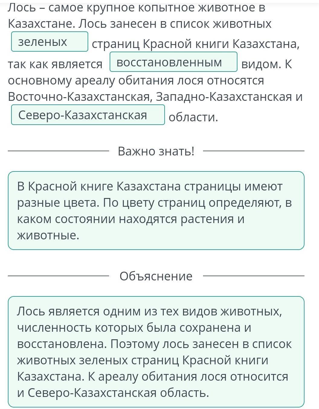 В предложенном тексте о лосе дополни предложения. Лось самое крупное копытное животное в Казахстане. Лось занесен в список животных страниц Красной книги Казахстана, так как является видом. К основному ареалу обитания лося относятся Восточно-Казахстанская, Западно-Казахстанская и у области.