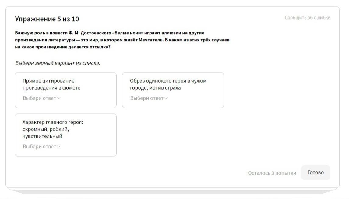 Важную роль в повести Ф. М. Достоевского «Белые ночи» играют аллюзии на другие произведения литературы — это мир, в котором живёт Мечтатель. В каком из этих трёх случаев на какое произведение делается отсылка?