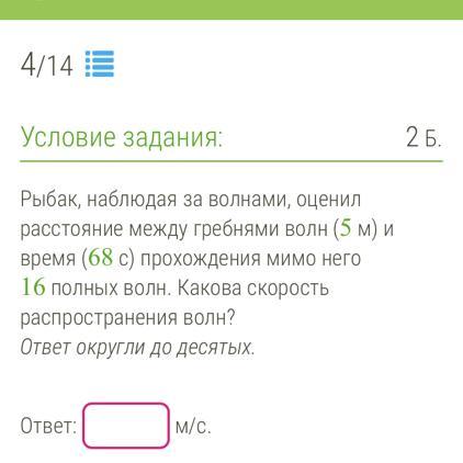 Ответ : скорость волны равна 5*16/68 = 1,2 м/сек.