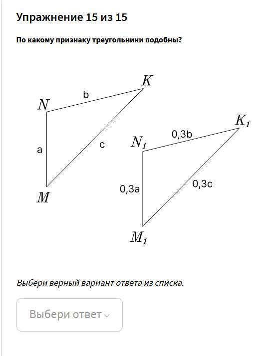 там 3 варианта: 1 признак подобия треугольников, 2 признак подобия треугольников, 3 признак подобия треугольников,