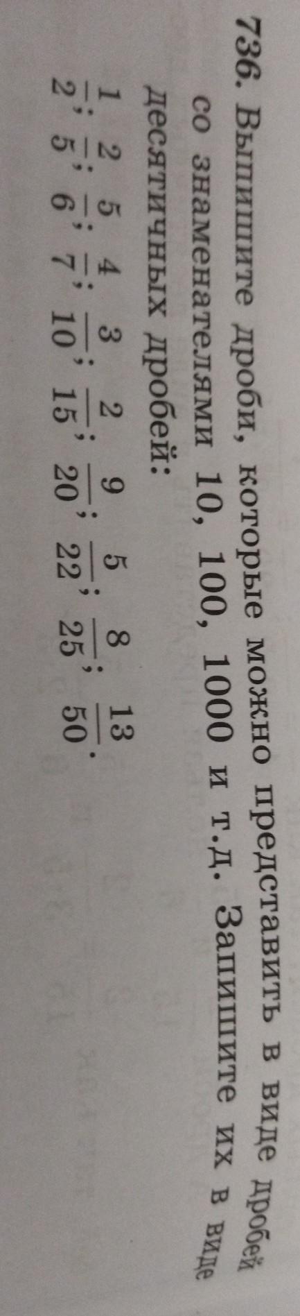 736, Выпишите дроби, которые можно предоставить в виде дробей со знаменателями 10, 100, 1000 и т.д пж помогите пожалуйста решить задания (