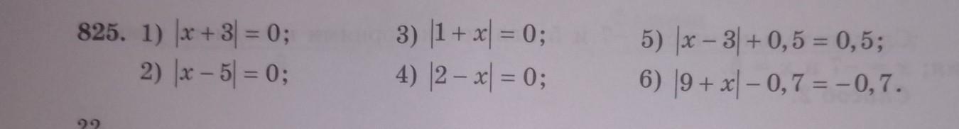 825. 1) |x + 3| = 0 ; |x - 5| = 0 2) ; |1 + x| = 0 3) ; 4) |2 - x| = 0 ; |x - 3| + 0, 5 = 0, 5 5) ; 6) |9 + x| - 0, 7 = - 0, 7