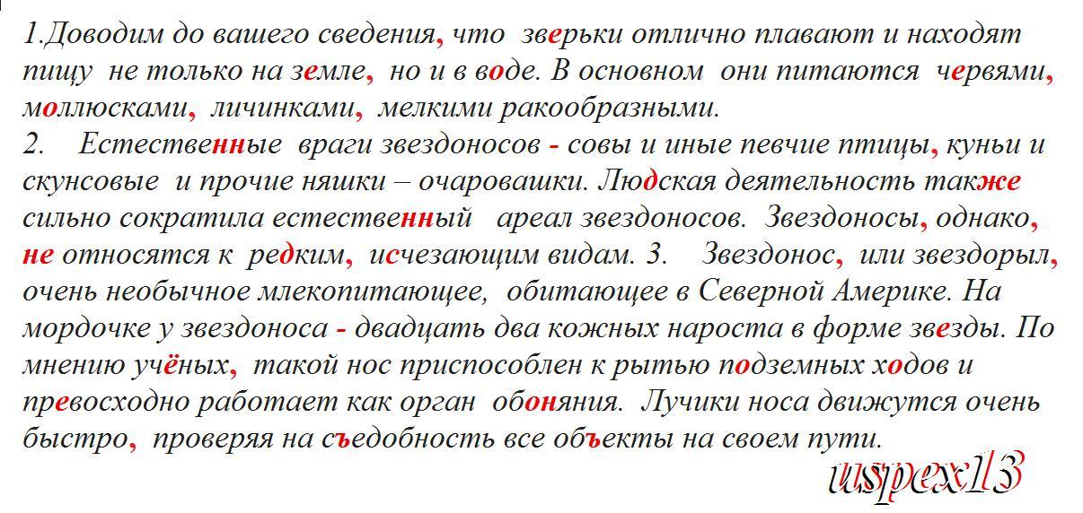 2. Естестве(н/нн)ые враги звездоносов совы и иные певчие птицы куньи и скунсовые и прочие няшки – очаровашки. Лю…ская деятельность так(же) сильно сократила естестве(н/нн)ый ареал звездоносов. Звездоносы однако (не)относят?ся к ре…ким и...чезающим видам. 3. Звездонос или звездорыл очень необычное млекопитающее, обитающее в Северной Америке. На мордочке у звездоноса двадцать два кожных нароста в фо. рме зв…зды. По мнению уч…ных такой нос приспособлен к рытью п…дземных х…дов и пр…восходно работает как орган об…яния. Лучики носа движутся очень быстро проверяя на с…едобность все об…екты на своем пути.