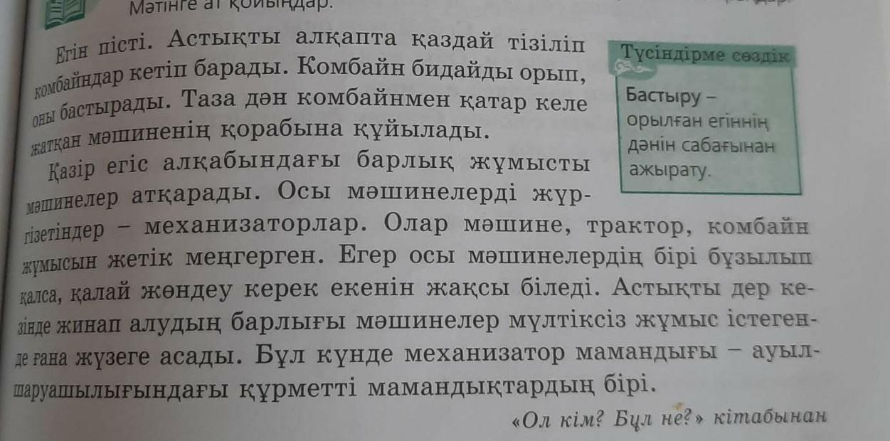 Егін пісіп қойған,астықты алқапта қаздай тізіліп комбайндар кетіп қалды.Комбаин бидайды орды да,оны бастырды.Таза дән комбайнмен қатар келе жатқан мәшиненің қорабына құйылды.