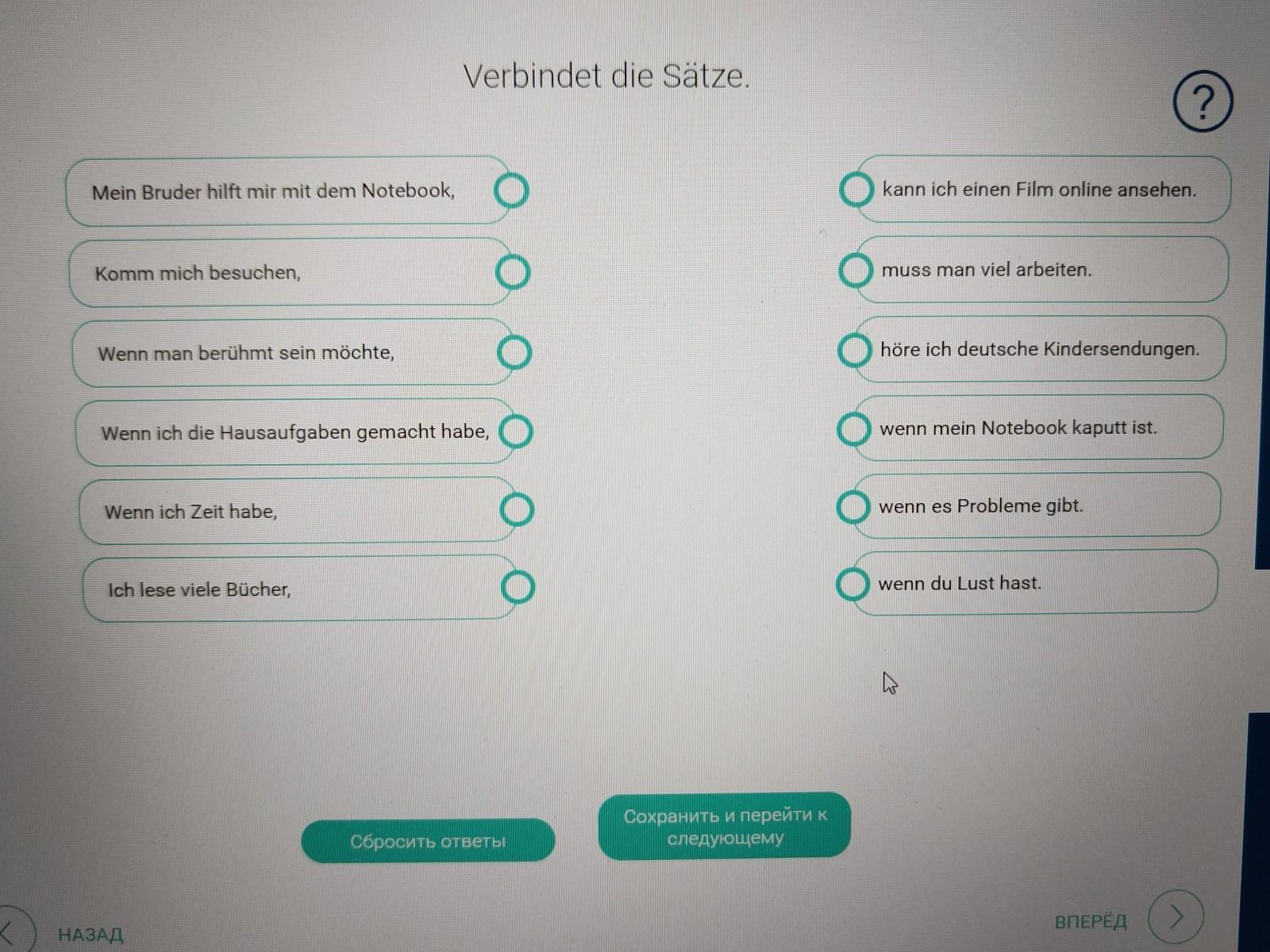 Verbindet die Sätze. ? Mein Bruder hilft mir mit dem Notebook, kann ich einen Film online ansehen. Komm mich besuchen, ООО muss man viel arbeiten. Wenn man berühmt sein möchte, höre ich deutsche Kindersendungen. Wenn ich die Hausaufgaben gemacht habe, wenn mein Notebook kaputt ist. Wenn ich Zeit habe, wenn es Probleme gibt. 00 Ich lese viele Bücher, wenn du Lust hast.