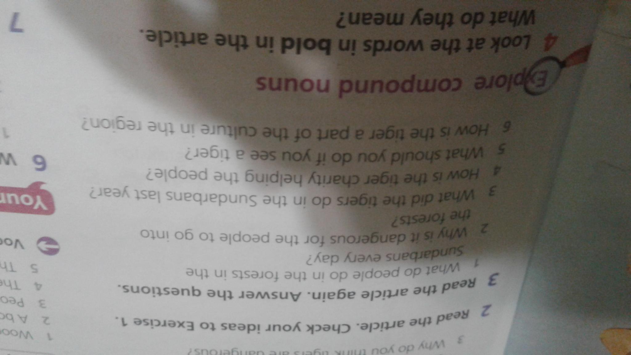 4.Local people are learning how to live and work close to tigers, how to look after tiger marks on the forest floor and listen for the sounds from other animals when there is a tigerr nearby.