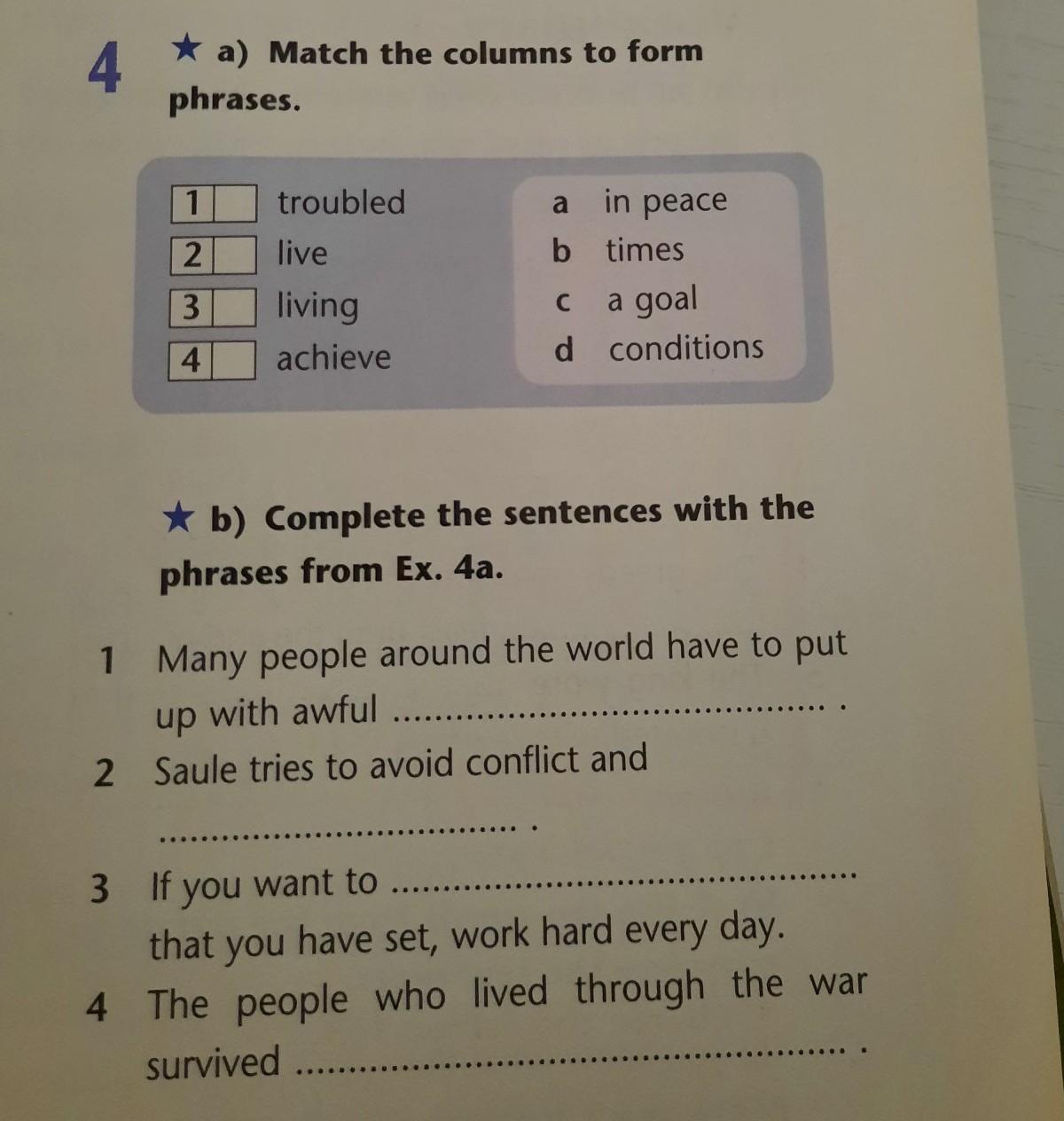 4 * a) Match the columns to form phrases. 1 a 2 troubled live living achieve in peace b times a goal d conditions 3 C 4 *b) Complete the sentences with the phrases from Ex. 4a. 1 Many people around the world have to put up with awful ... 2 Saule tries to avoid conflict and 3 If you want to ... that you have set, work hard every day. 4 The people who lived through the war survived ....