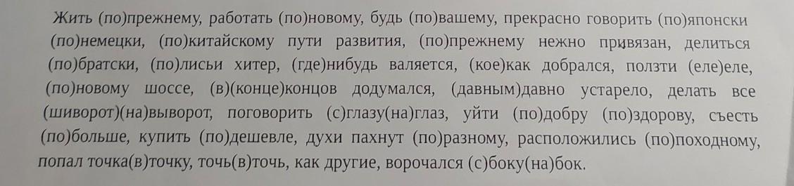 Жить по-прежнему, работать по-новому, будь по-вашему, прекрасно говорить по-японски, по-немецки, по китайскому пути развития, по-прежнему нежно привязан, делиться по-братски, по-лисьи хитер, где-нибудь валяется, кое-как добрался, ползти еле-еле, по новому шоссе, в конце концов додумался, давным-давно устарело, делать все шиворот-навыворот, поговорить с глазу на глаз, уйти подобру-поздорову, съесть побольше, купить подешевле, духи пахнут по-разному, расположились по-походному, попал точка в точку, точь-в-точь как другие, ворочался с боку на бок.