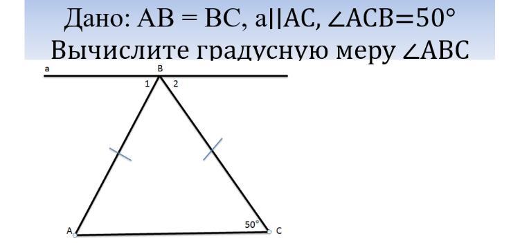 Так как AB = BC, то ΔABC - равнобедренный, а значит углы при основании равны, т. е. ∠BAC = ∠BCA = 50°.