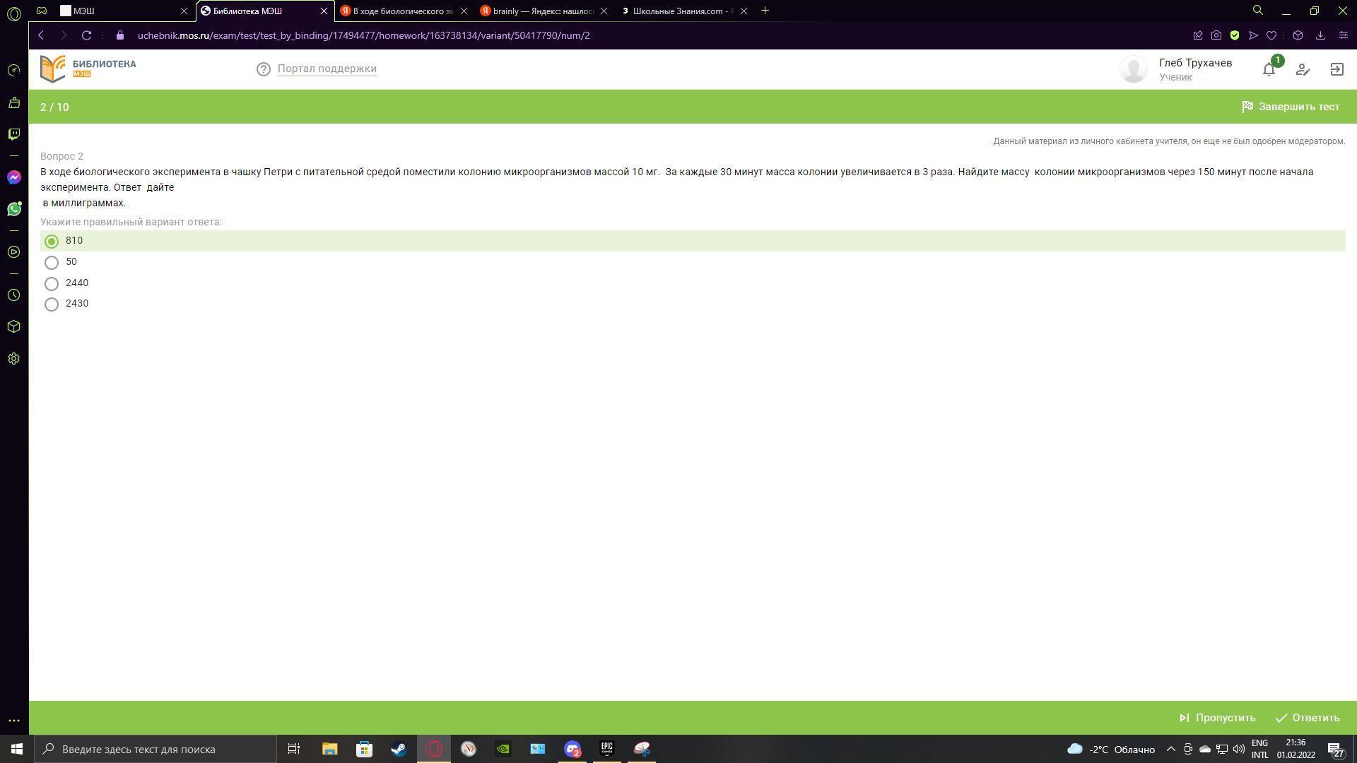 В ходе биологического эксперимента в чашку Петри с питательной средой поместили колонию микроорганизмов массой 10 мг. За каждые 30 минут масса колонии увеличивается в 3 раза. Найдите массу колонии микроорганизмов через 150 минут после начала эксперимента. Ответ дайте