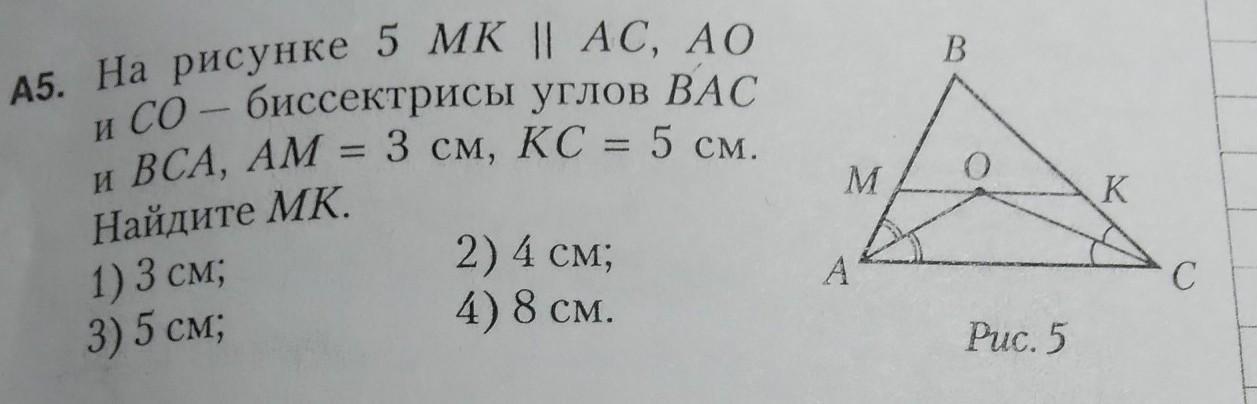 MK = MO + OK = MA + KC = 5 + 3 = 8 см.