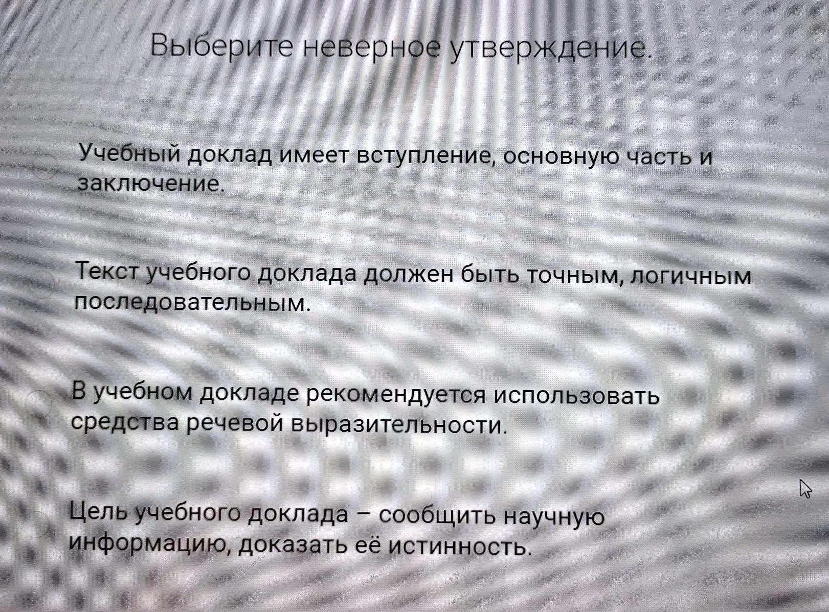 Выберите неверное утверждение. 1)Учебный доклад имеет вступление, основную часть и заключение.