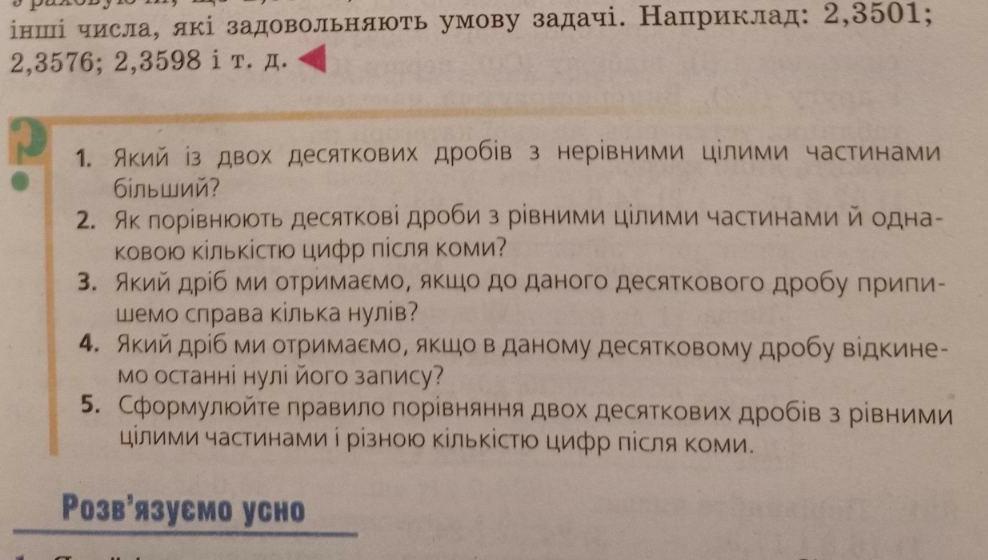 5. Більшим буде той, в якому перша цифра після коми буде більша, якщо вони однакові, то в якому друга цифра після коми буде більше, а якщо й вони однакові, то в якому третя цифра після коми буде більше й так поки у одного з цих десяткових дробів не залишиться числа після коми