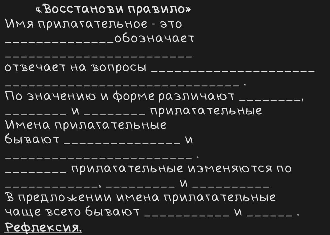 Имя прилагательное - это самостоятельная часть речи, которая обозначает признак предмета, отвечает на вопросы какой? (какая? какое? какие?) чей? (чья? чье? чьи?). По значению и форме различают качественные, относительные и притяжательные прилагательные. Имена прилагательные бывают полные и краткие. Полные прилагательные изменяются по по родам, числам и падежам. В предложениях имена прилагательные чаще всего бывают определениями и сказуемыми.