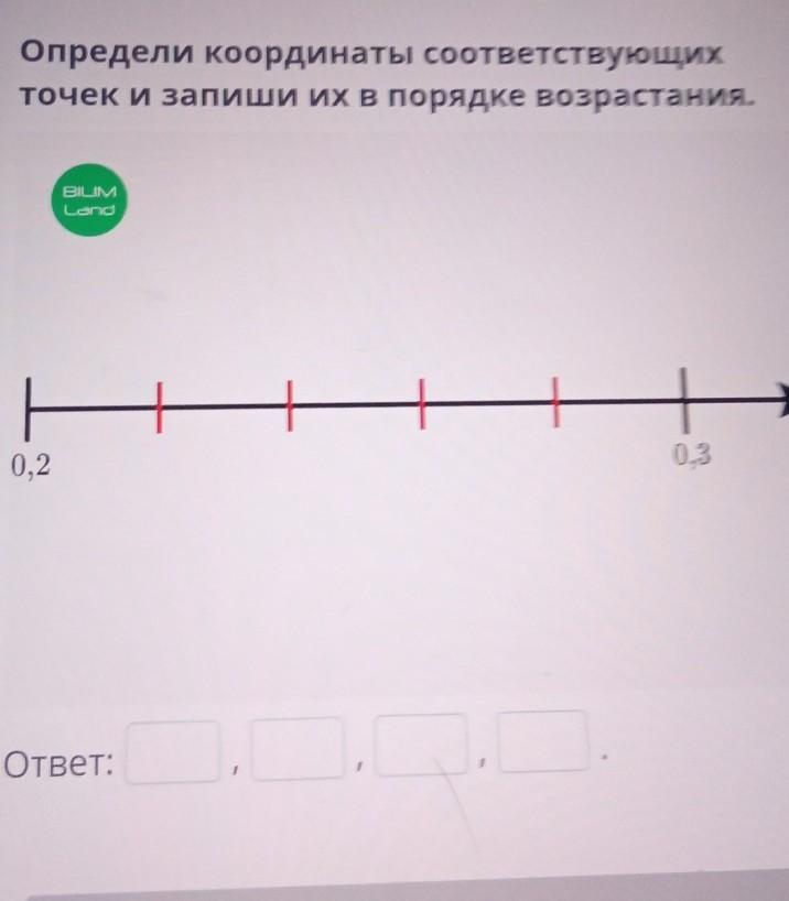 Определи координаты соответствующих точек и запиши их в порядке возрастания. BILIM Land — 0,2 0,3 Ответ: