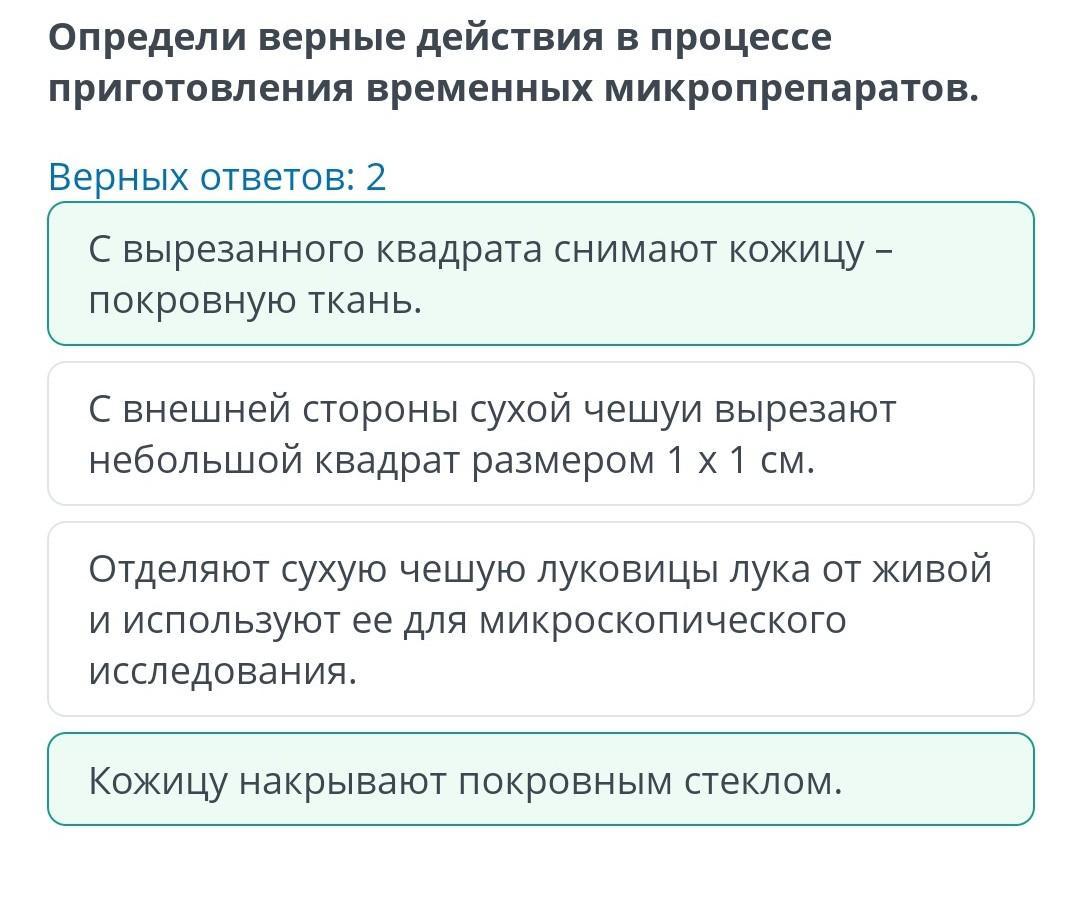 Определи верные действия в процессе приготовления временных микропрепаратов. Верных ответов: 2 Отделяют сухую чешую луковицы лука от живой и используют ее для микроскопического исследования. С внешней стороны сухой чешуи вырезают небольшой квадрат размером 1х1 см. С вырезанного квадрата снимают кожицу – покровную ткань. Кожицу накрывают покровным стеклом.