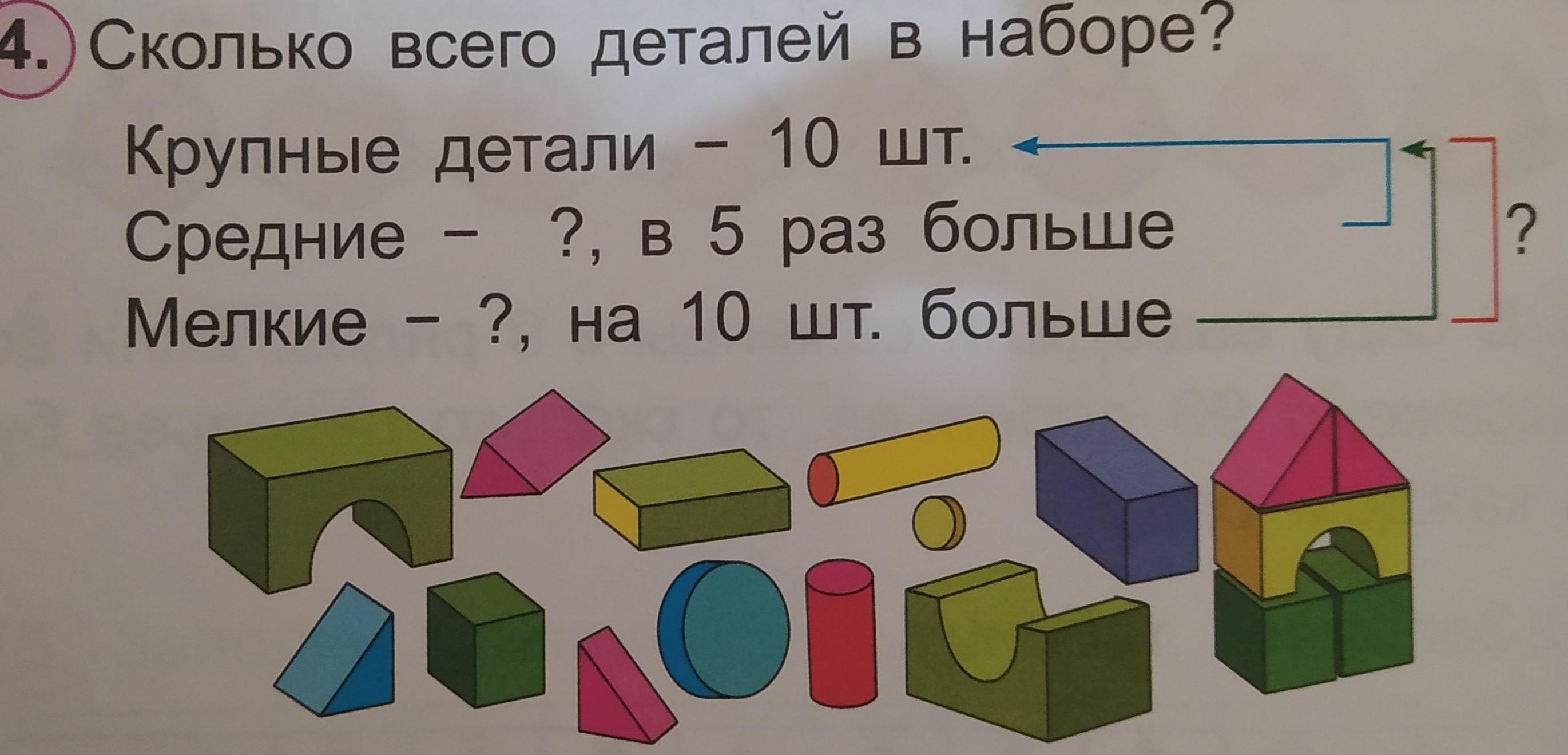 Сколько всего деталей в наборе? Крупные детали - 10 шт. Средние – ?, в 5 раз больше Мелкие ?, на 10 ШТ. больше ?