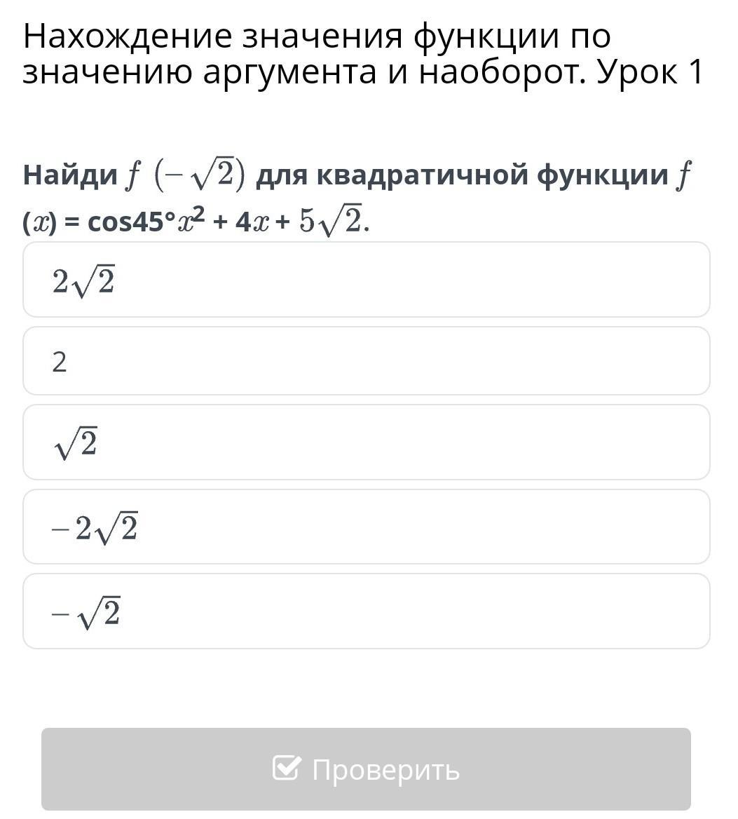 Нахождение значения функции по значению аргумента и наоборот. Урок 1 Найди f для квадратичной функции f (x) = cos45°x2 + 4x + 2 Назад Проверить