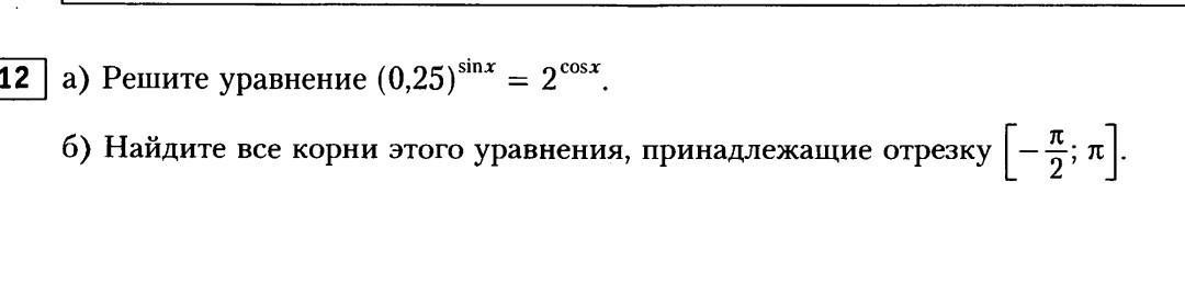 Так как 0,25=2^(-2), то данное уравнение приводится к виду: 2^[-2*sin(x)]=2^cos(x). Отсюда -2*sin(x)=cos(x), -2*tg(x)=1 и tg(x)=-1/2. Тогда x=atctg(-1/2)+π*n=π*n-arctg(1/2), где n∈Z. Отсюда следует, что x∈[-π/2;π] в тех случаях, когда n=0 и n=1. Находим соответствующие значения x: x1=-arctg(1/2), x2=π-arctg(1/2).
