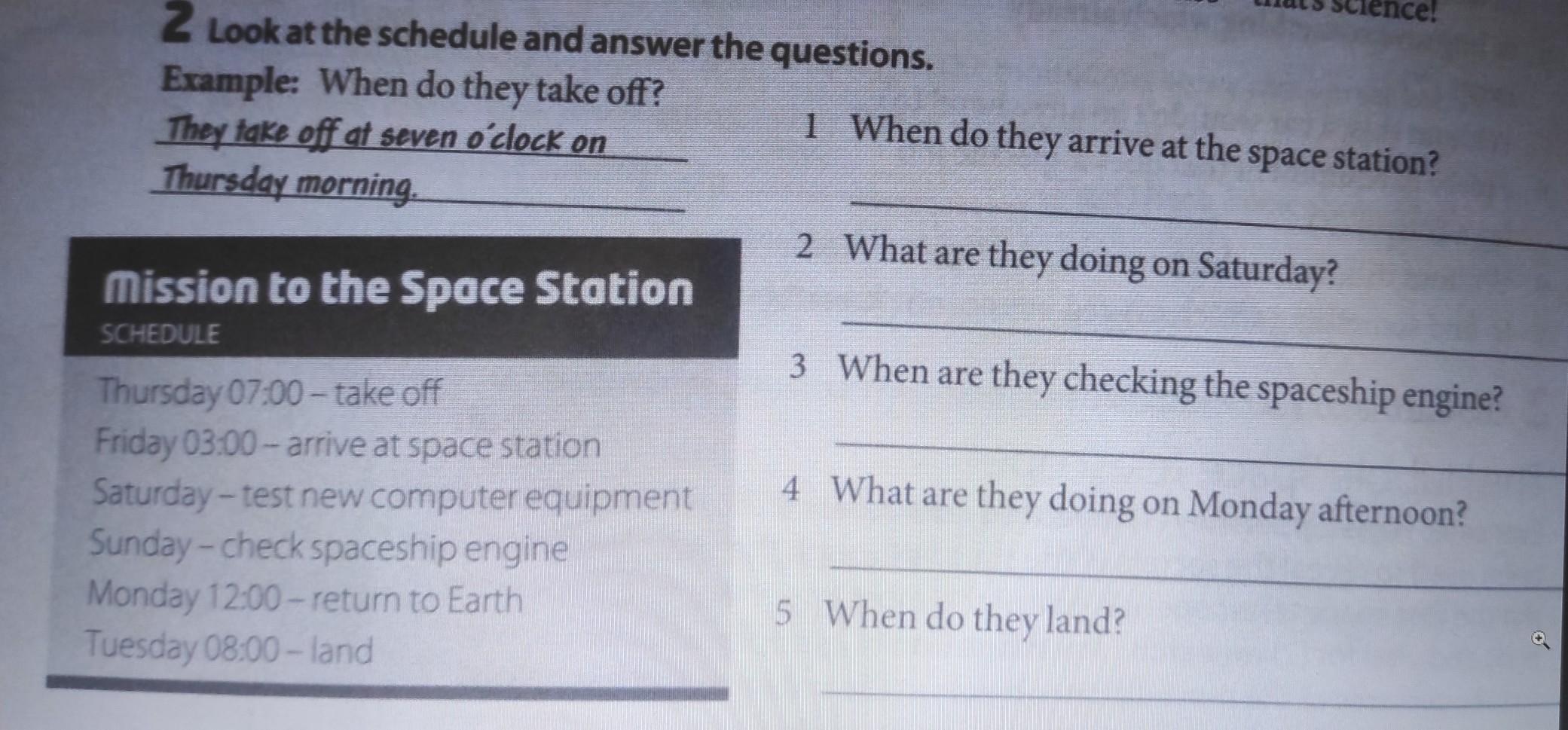 1 When do they arrive at the space station? 2. What are they doing on Saturday? 3 When are they checking the spaceship engine? 4 What are they doing on Monday afternoon? 5 When do they land?