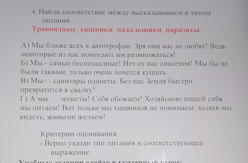 4. Найди соответствие между высказыванием и типом Питания: Травоядные, хищники, падальщики, паразиты А) Мы ближе всех к автотрофам. Зря они нас не любят! Ведь некоторые из нас помогают им размножаться! Б) Мы - самые беспощадные! Нет от нас спасения! Мы бы не были такими, только очень хочется кушать. В) Мы — санитары планеты. Без нас Земля быстро превратится в свалку! Г) А мы — эгоисты! Себя обожаем! Хозяйскою пищей себя Мы питаем! Вот только мы хищников не понимаем: хозяев мы Видеть, ЖИВЫМи желаем! Критерии оценивания: - Верно указан тип питания и соответствующее Выражение.