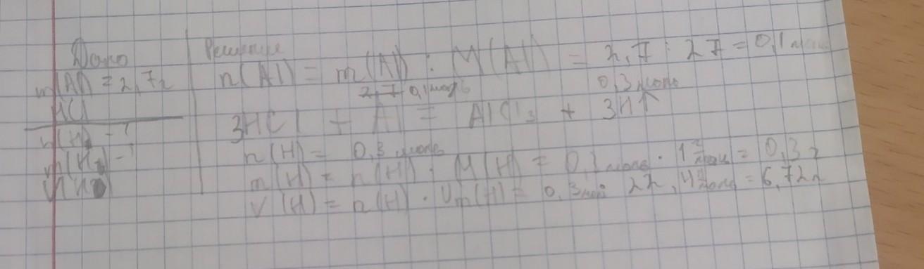 Вычислите количество вещества,объем (н.у) массу водорода,образующегося при взаимодействии 2,7 г алюминия с достаточным количеством соляной кислоты(оформить решение задачи)