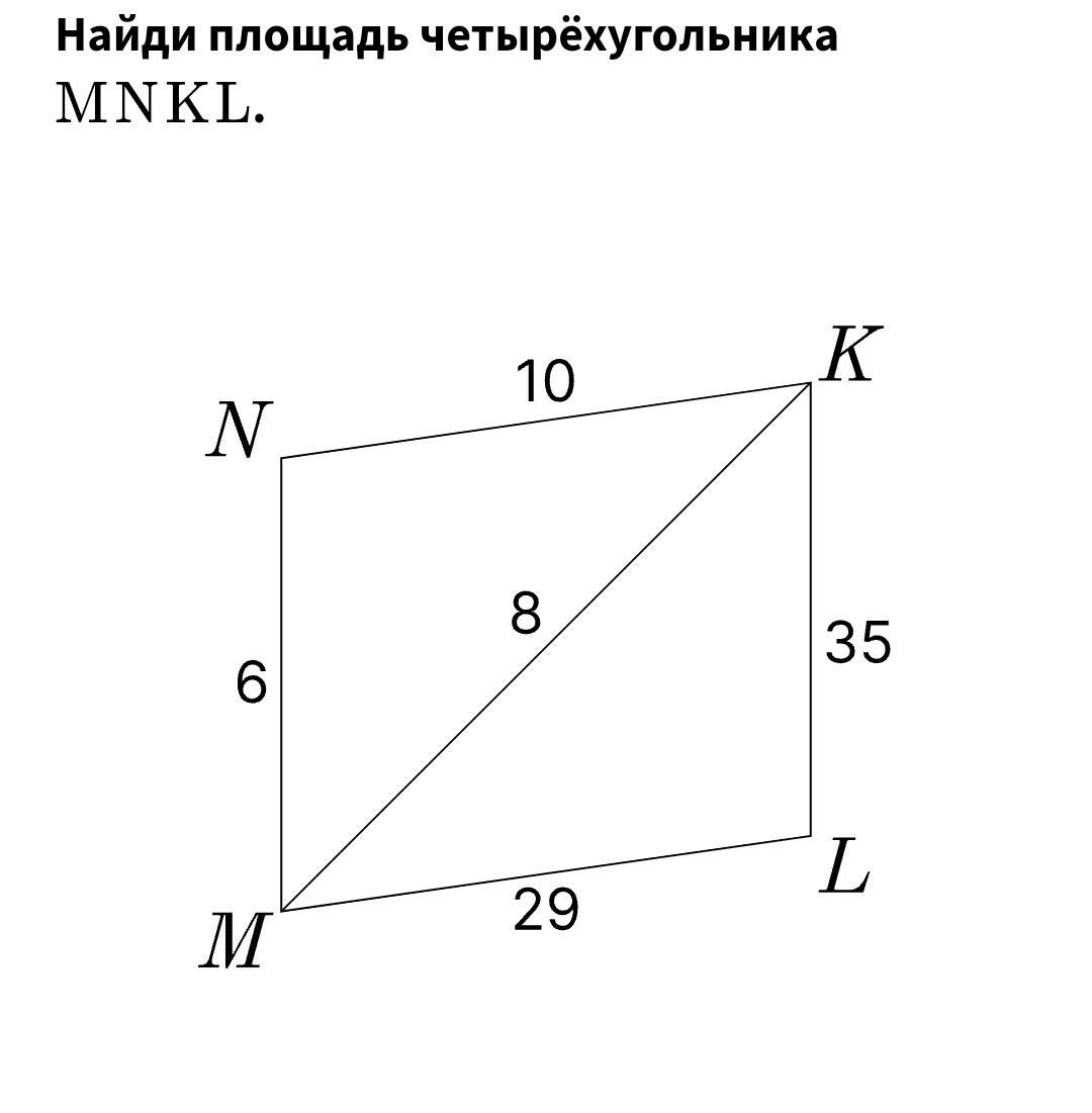 площадь четырехугольника найдем,применяя формулу Герона: S =√p(p-a)(p-b)(p-c),где р ролупериметр треугольника,a,b,c стороны треугольника.В треугольникеMNK p=(6+10+8)/2=24:2=12,в треугольнике MKL p=(8+35+29)/2=36