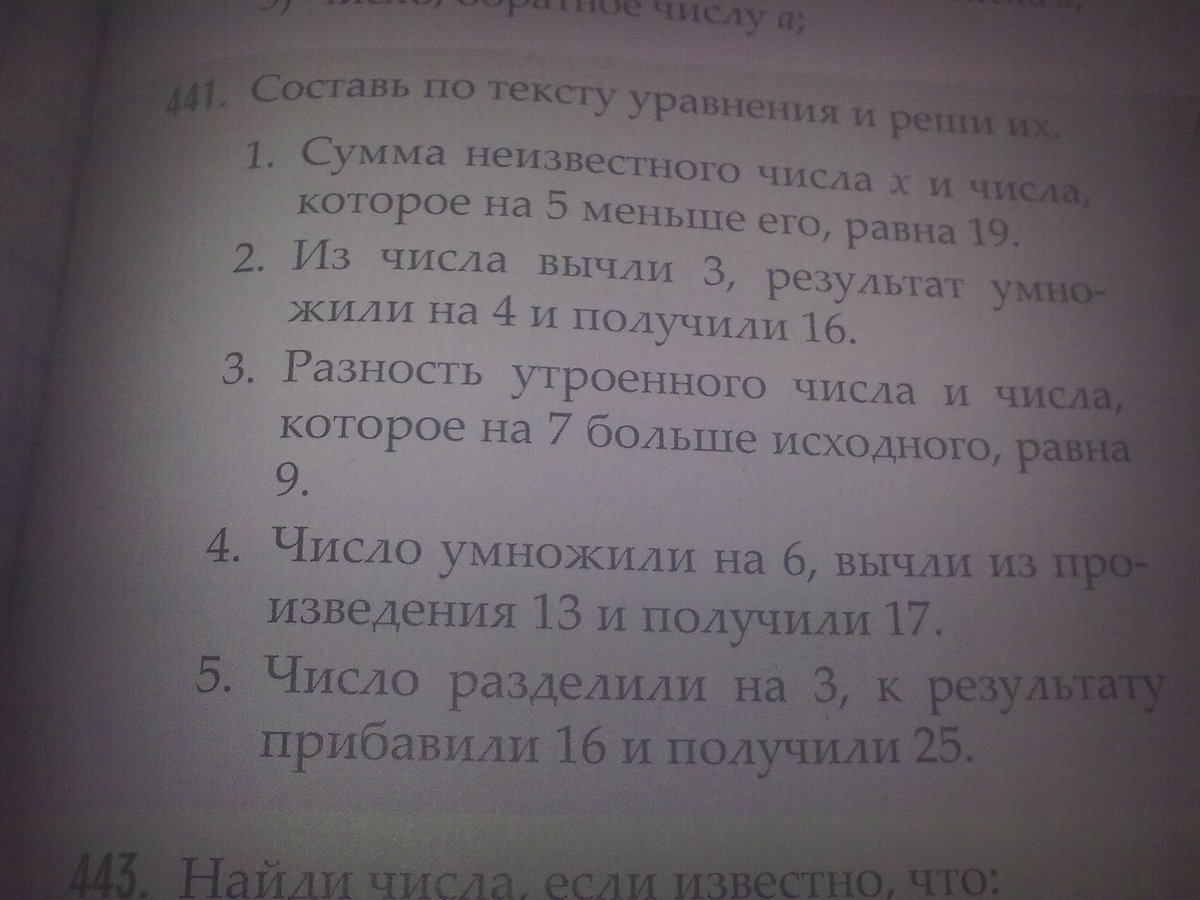 441) 1)x+(x-5)=19 2) (x-3)*4=16 4) 6x-13=17 5) (x:3)+16=25 3) 3x-(7+x)=9