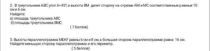 2) BM-высота; ∠MAB=90°; ∠A=45°⇔∠ABM=180-90-45=45°
