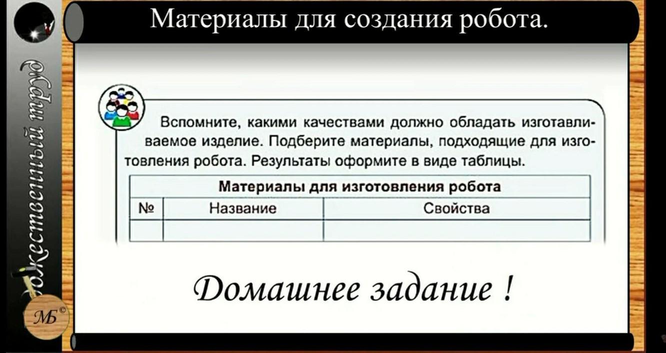 Вспомните, какими качествами должно обладать изготавли ваемое изделие. Подберите материалы, подходящие для изготовления робота. Результаты оформите в виде таблицы. Помогите пожалуйста!