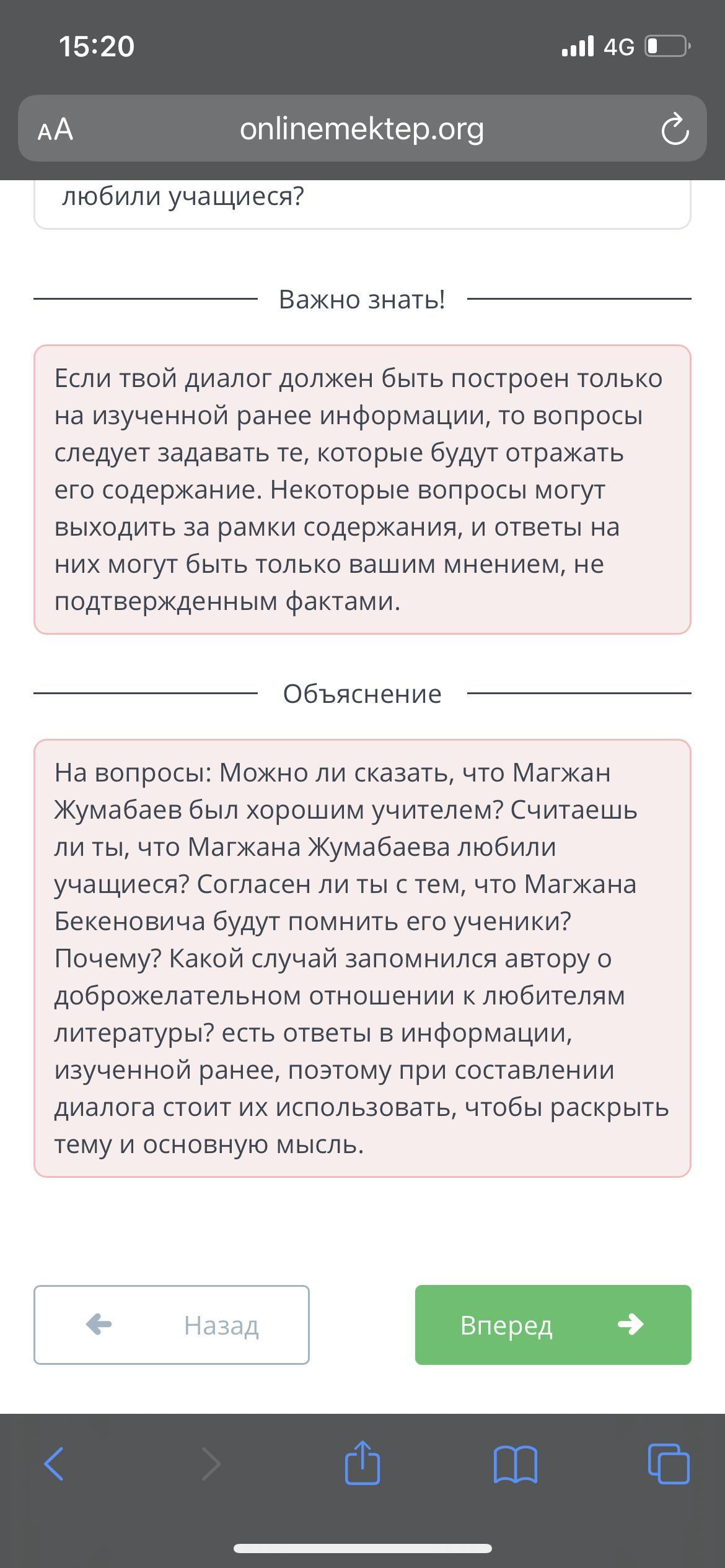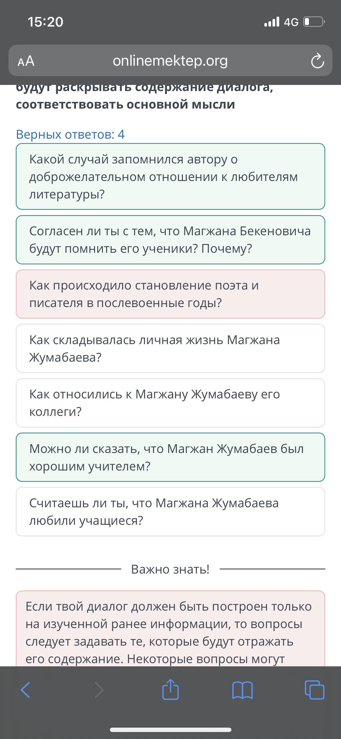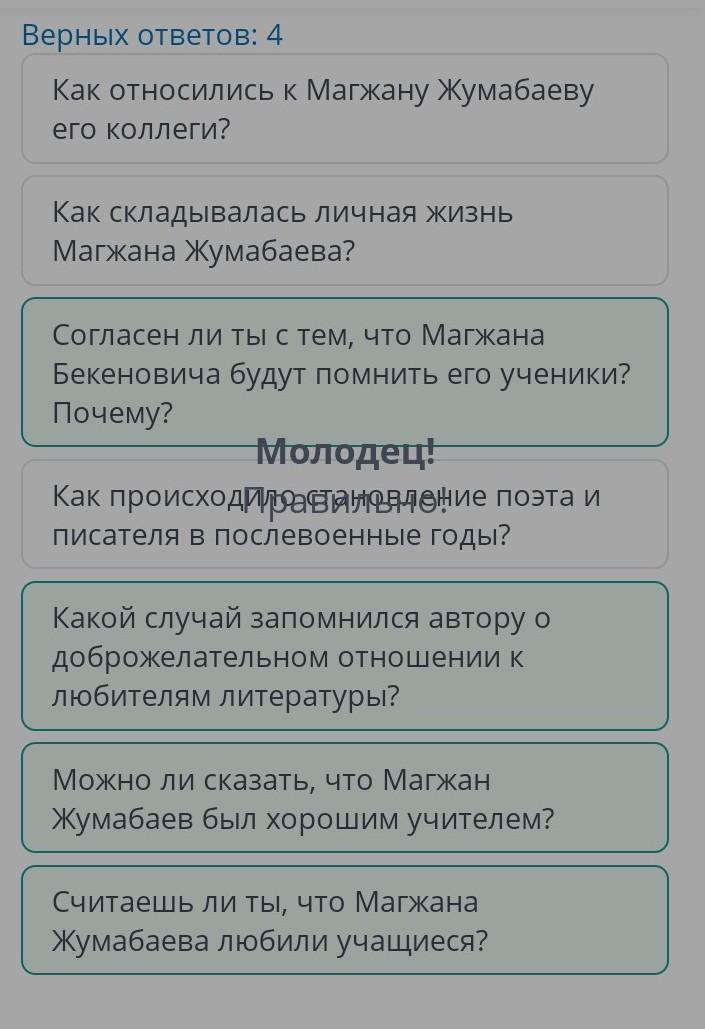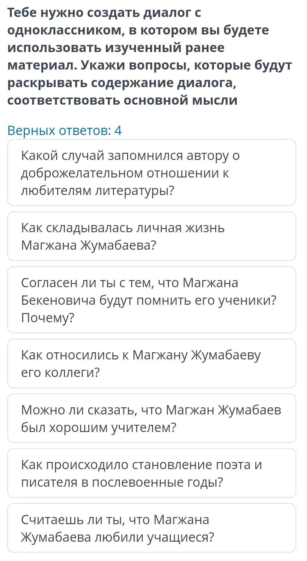Тебе нужно создать диалог с одноклассником, в котором вы будете использовать изученный ранее материал. Укажи вопросы, которые будут раскрывать содержание диалога, соответствовать основной мысли Верных ответов: 4 Какой случай запомнился автору о доброжелательном отношении к любителям литературы? Как складывалась личная жизнь Магжана Жумабаева? Согласен ли ты с тем, что Магжана Бекеновича будут помнить его ученики? Почему? Как относились к Магжану Жумабаеву его коллеги? Можно ли сказать, что Магжан жумабаев был хорошим учителем? Как происходило становление поэта и писателя в послевоенные годы? Считаешь ли ты, что Магжана Жумабаева любили учащиеся?