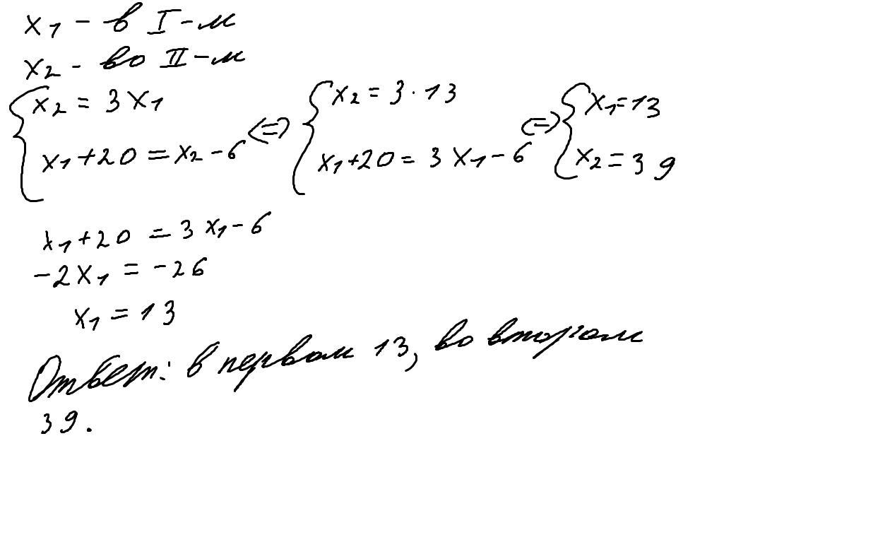 4. В одном шкафу было в 3 раза меньше книг, чем в другом. Когда в первый шкаф положили 20 книг, а из второго взял б, то в обоих шкафах книг стало поровну